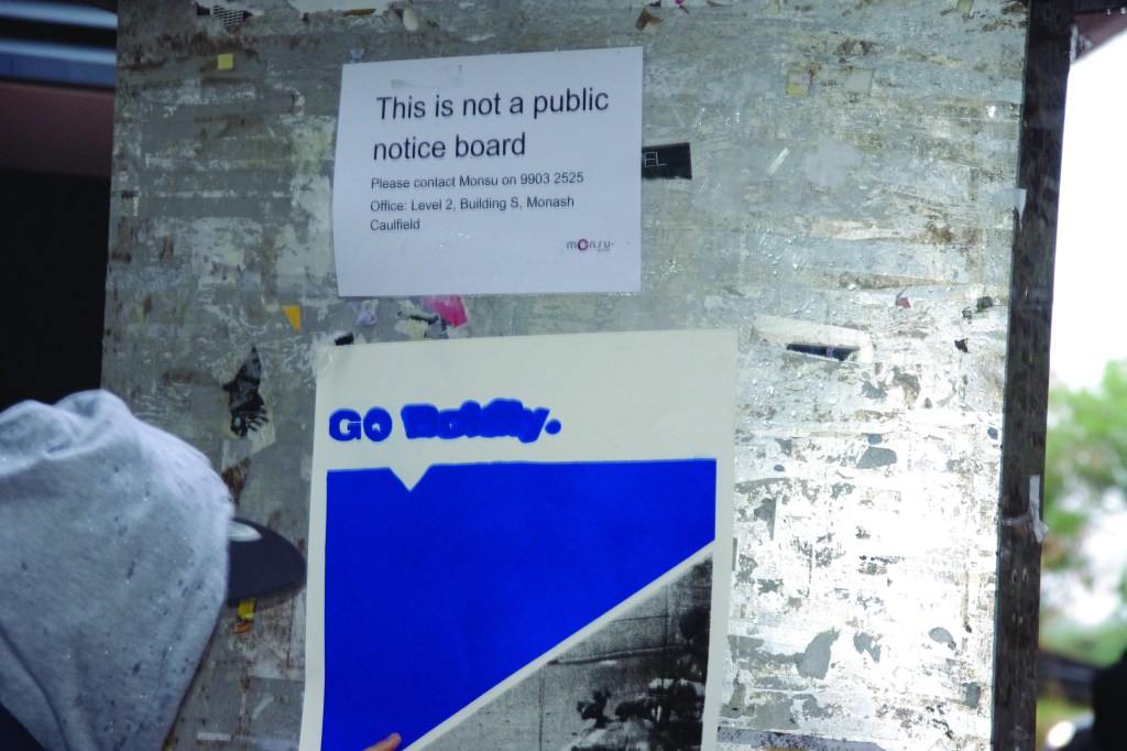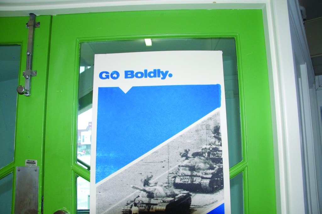 Go Boldly (2013) screenprint series, 42 × 29.7cm. Paste-ups by the artist at the Monash University Caulfield Campus, Australia.