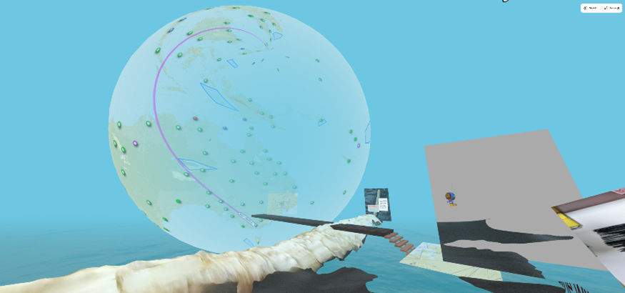 Flight Plan (2022) comprised an installation featuring speculative flight diagrams and a 3d modelled, ‘speculative artifact from a future’ has been scaled up to the size of walkable terrain. The artefact was conceived as an iterative collaboration between Williams and Ingrid Petterson (who chose the artefact); Michael Morgan (who originated the artefact); it is used in Ingrid Petterson’s performance with black helmets, developed by Michael, that will be staged as part of the exhibition before being symbolically interred to the waters of Port Phillip Bay. Other speculative cargo will be added to the Metaverse installation before the flight planned in On Autopilot; this will include photographs- these items are based on gifts previously given by the artist’s mother to bring to relatives in Vietnam, and those given in return to bring to Australia (a block of Cadbury’s chocolate and a bag of dried shrimps).