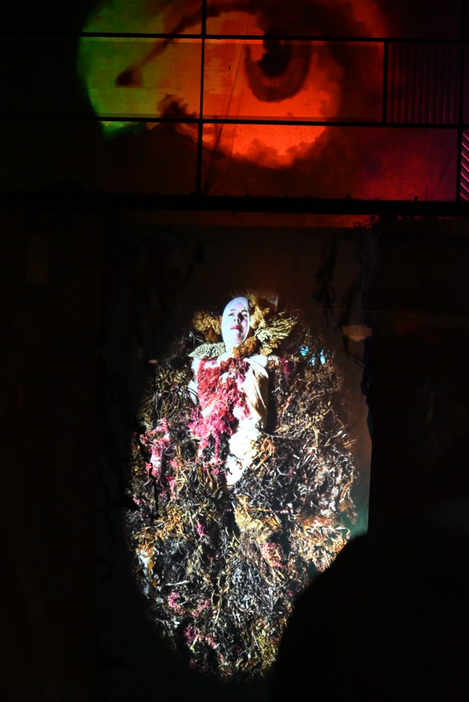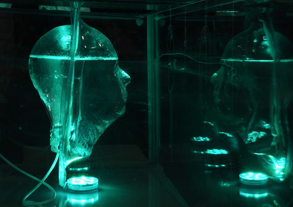 In humanity’s early history, symbiosis with nature was the key element of survival and prosperity. In our deep psyche, we still consider ourselves to be a part of this process, but civilization has put us at extreme odds with the natural world. We need to re-evaluate our position in nature, rediscover lost knowledge, and nurture the natural world that the human body and mind are part of. There is always more beneath the surface: this light installation shows micro-environments contained in a fish tank in the forms of a human head – both constructed and natural, using glass, plastic, water, and air. The background projection reflects energy and growth.