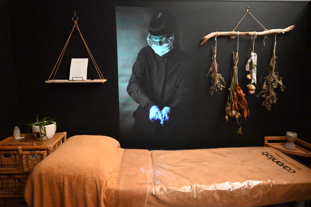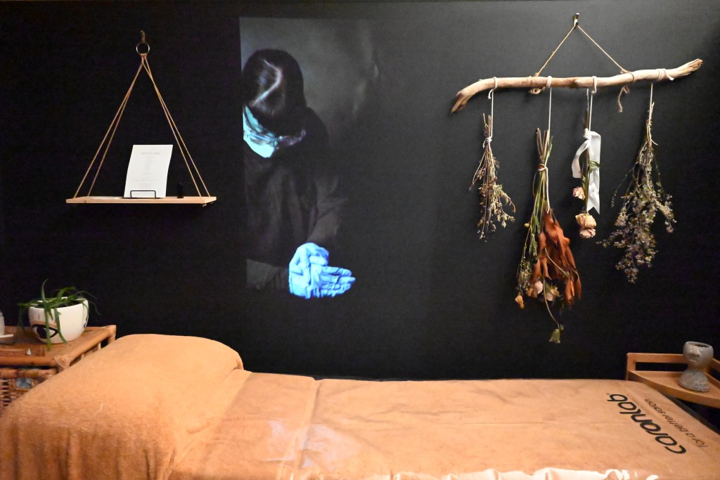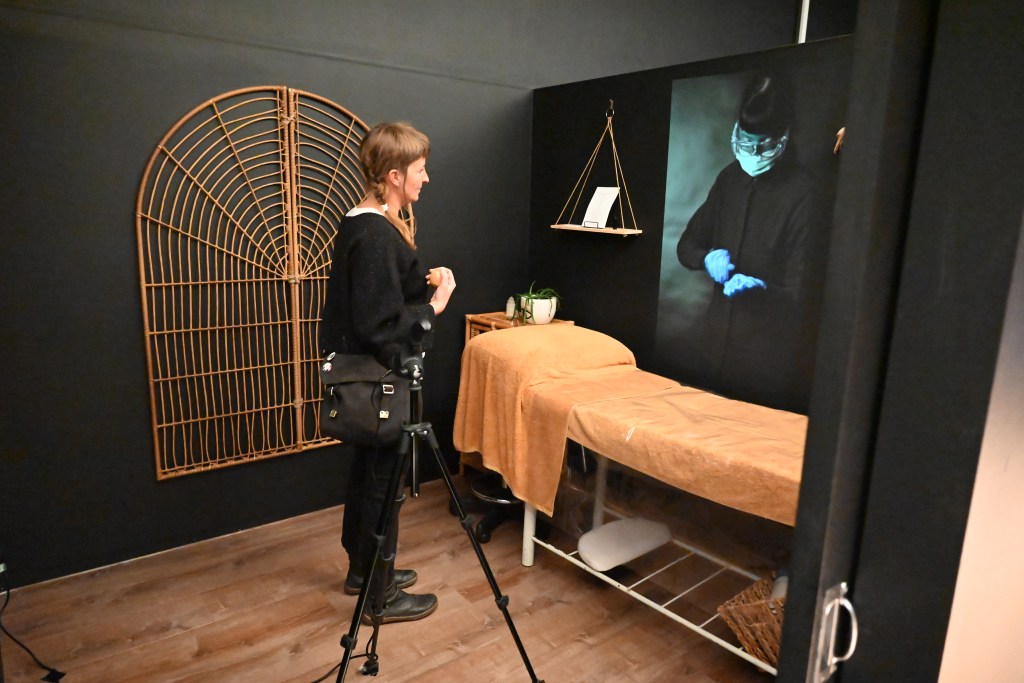Hands-on, after the distance (2021) is a site specific performance video installation at Omega Holistic, Little Malop St. Geelong. It comprises two video projections of a performance by artist and practicing physiotherapist Jessica Laraine Williams. The performance is constructed to appear as a disembodied massage treatment conducted remotely- an inherently absurd concept that dissects the notion of ‘hands-on’ practice in a socially-distanced world. Hands-on, after the distance, responds to the symbolic shifts in identity and practice that demarcate an extraordinary period of Australian pandemic time. A customised PPE visor and sterile blue are among the artist’s characteristic identifiers in her regular clinical work. They are enshrined through focal use of colour in the artworks.